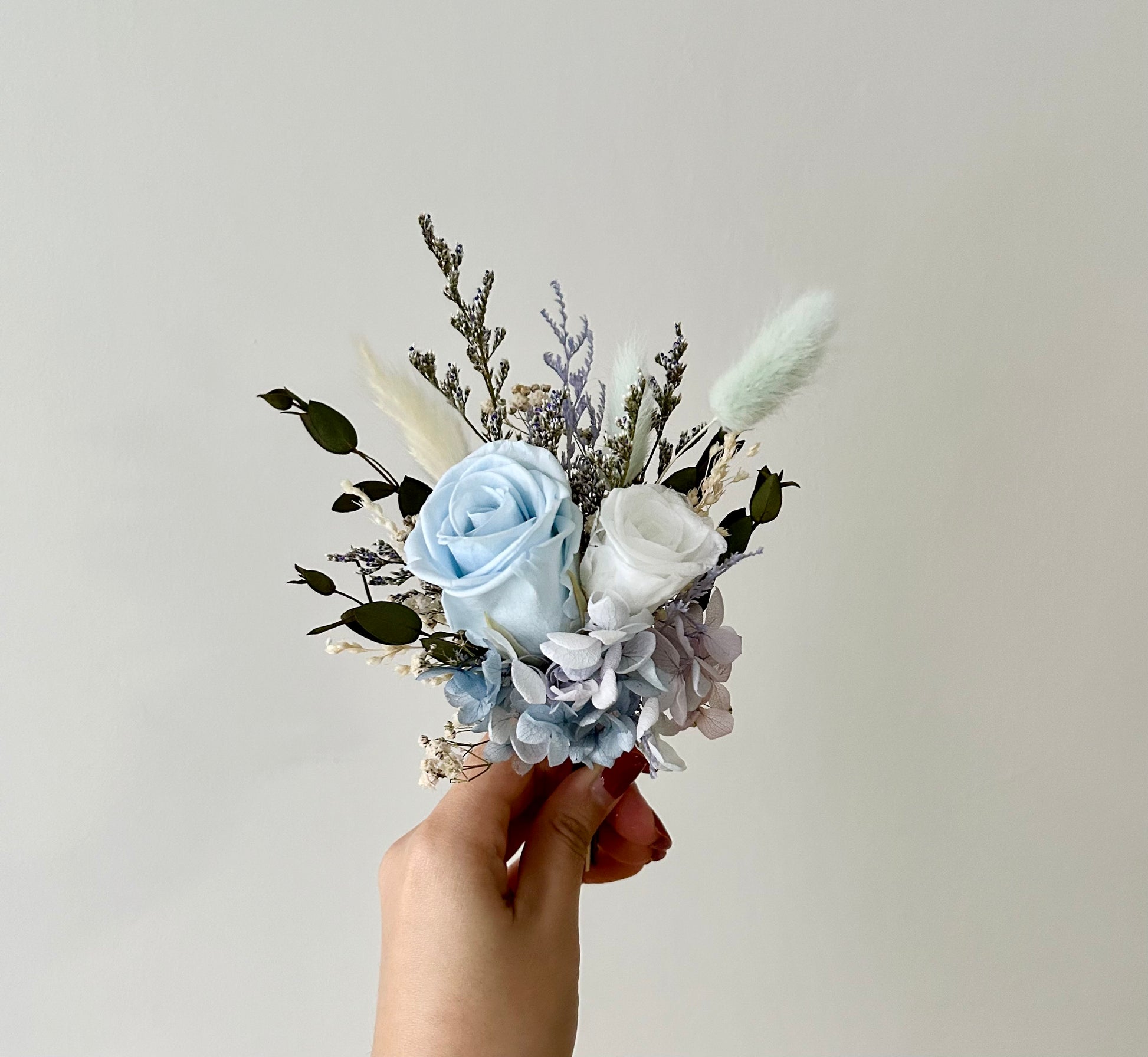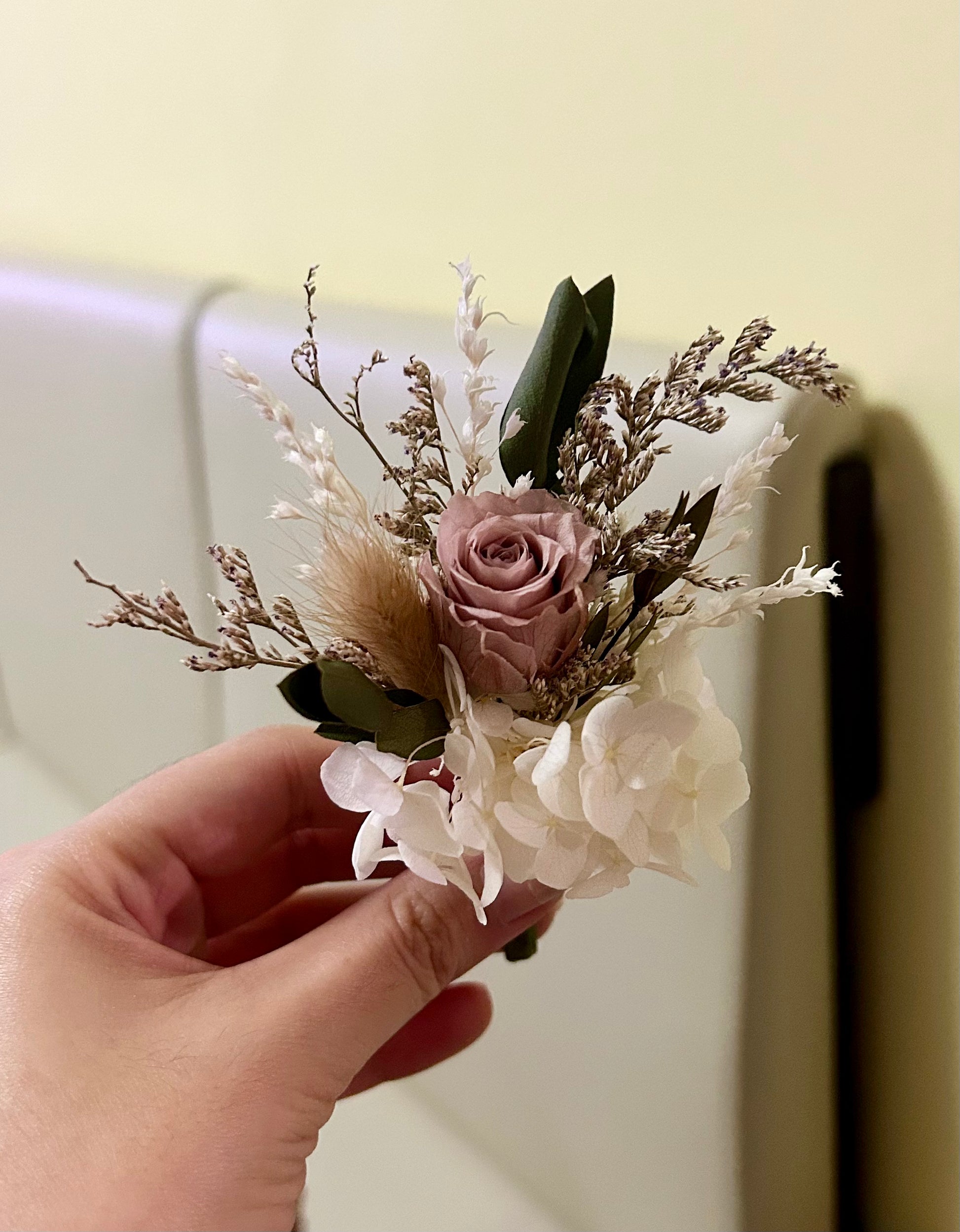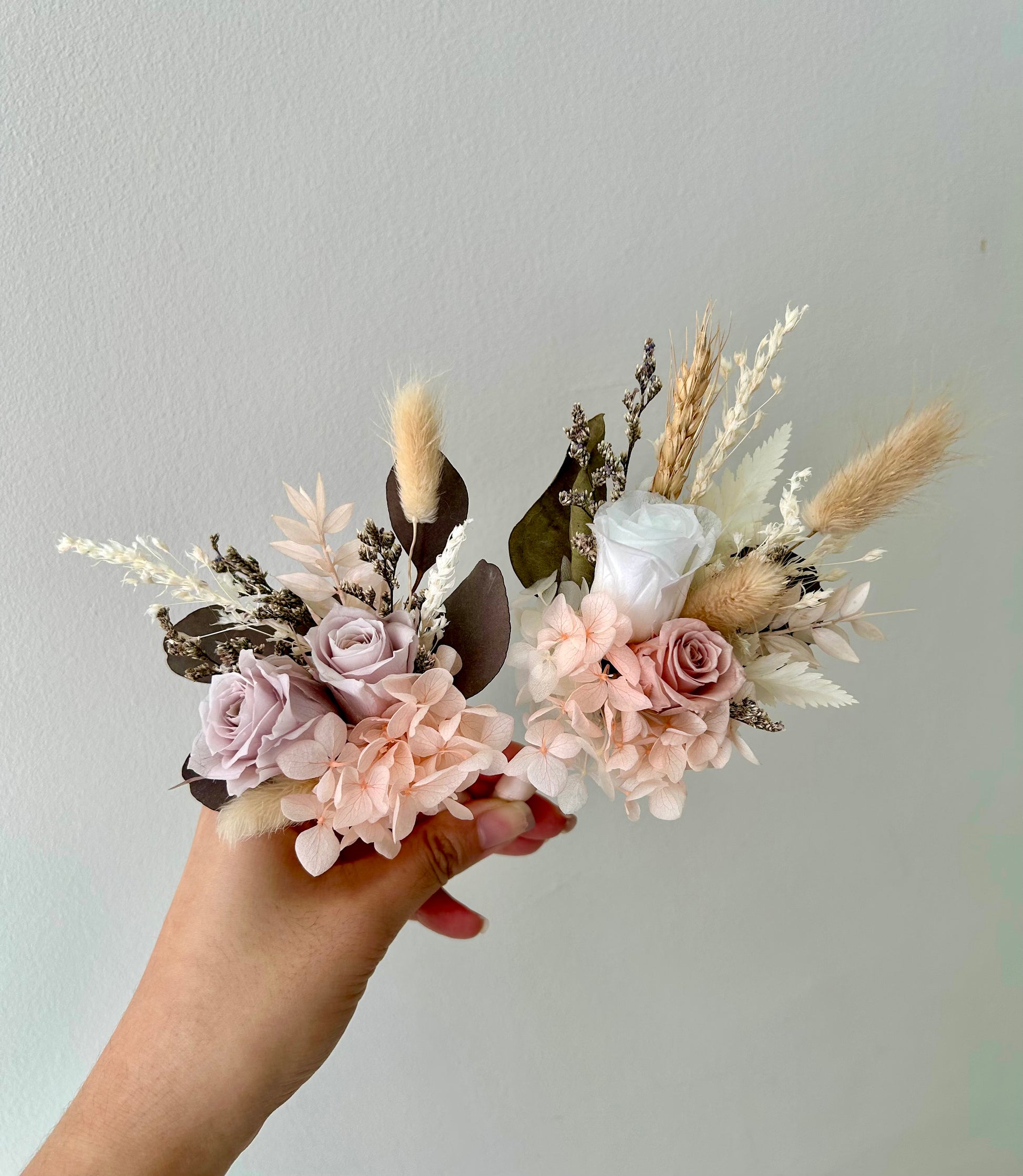 Add-on boutonnière, wrist corsages or bridesmaids’ posies for your wedding entourage! They will be designed to match your bridal bouquet’s colour and style chosen.