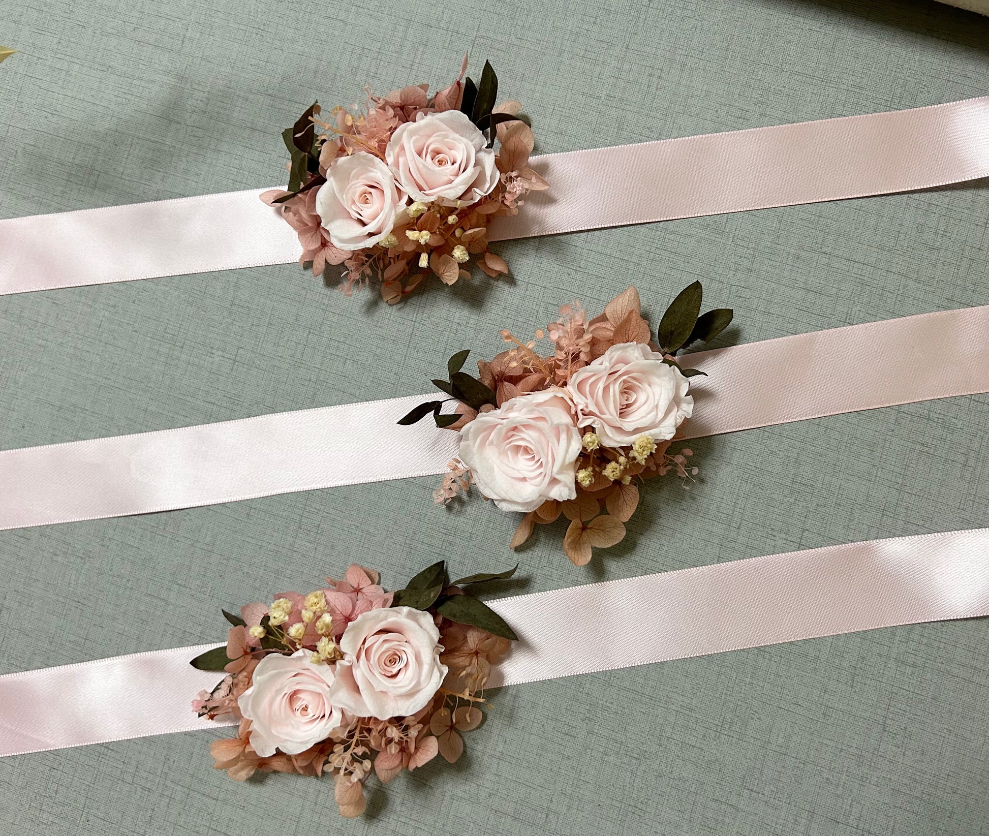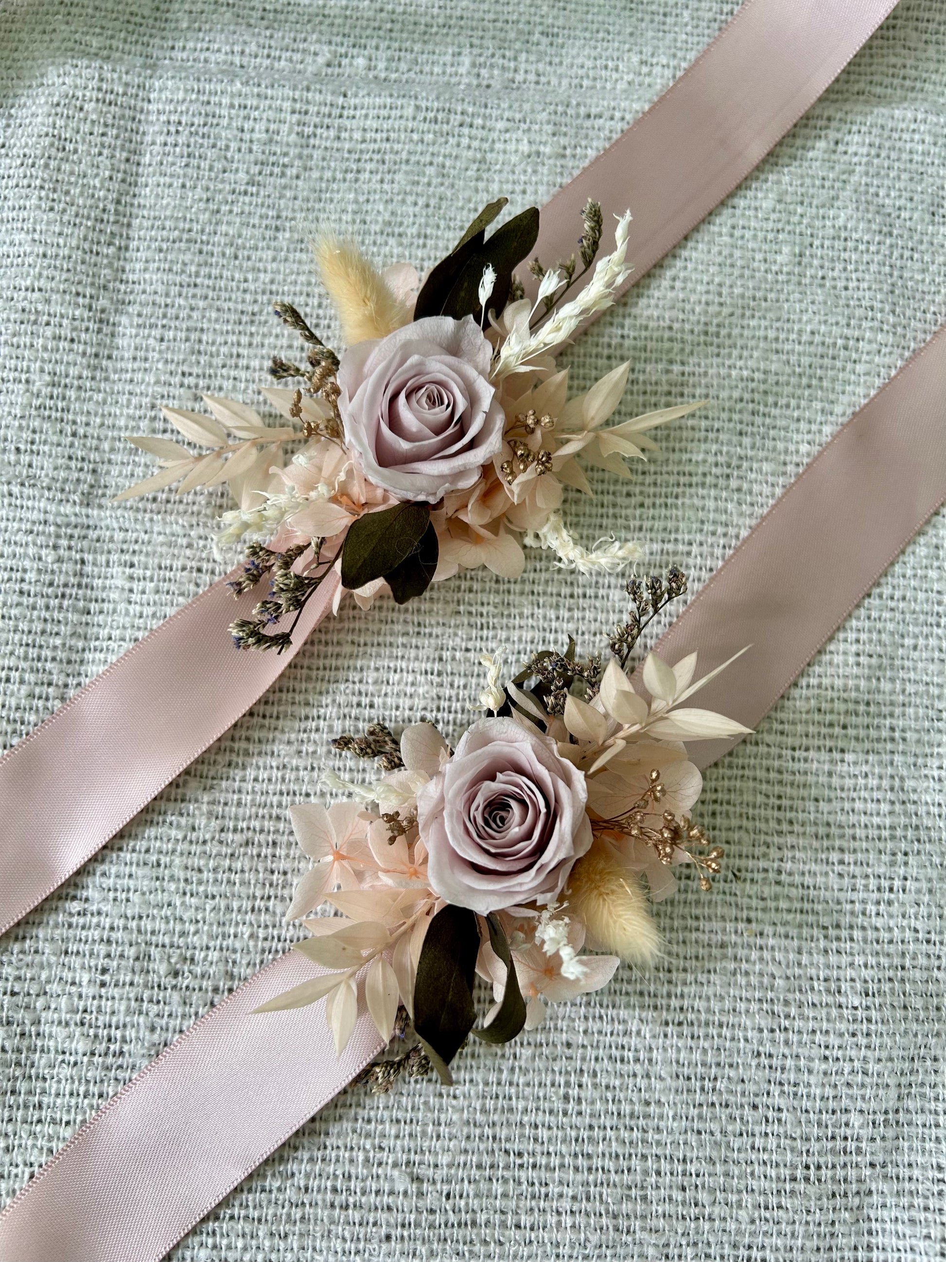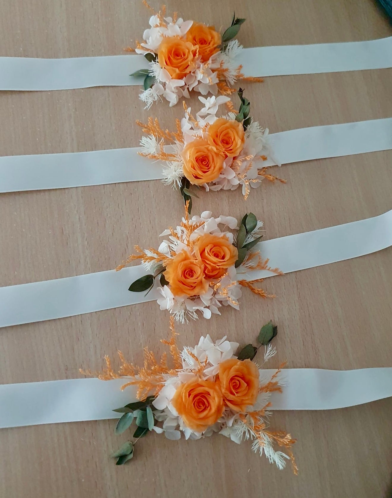 Add-on boutonnière, wrist corsages or bridesmaids’ posies for your wedding entourage! They will be designed to match your bridal bouquet’s colour and style chosen.